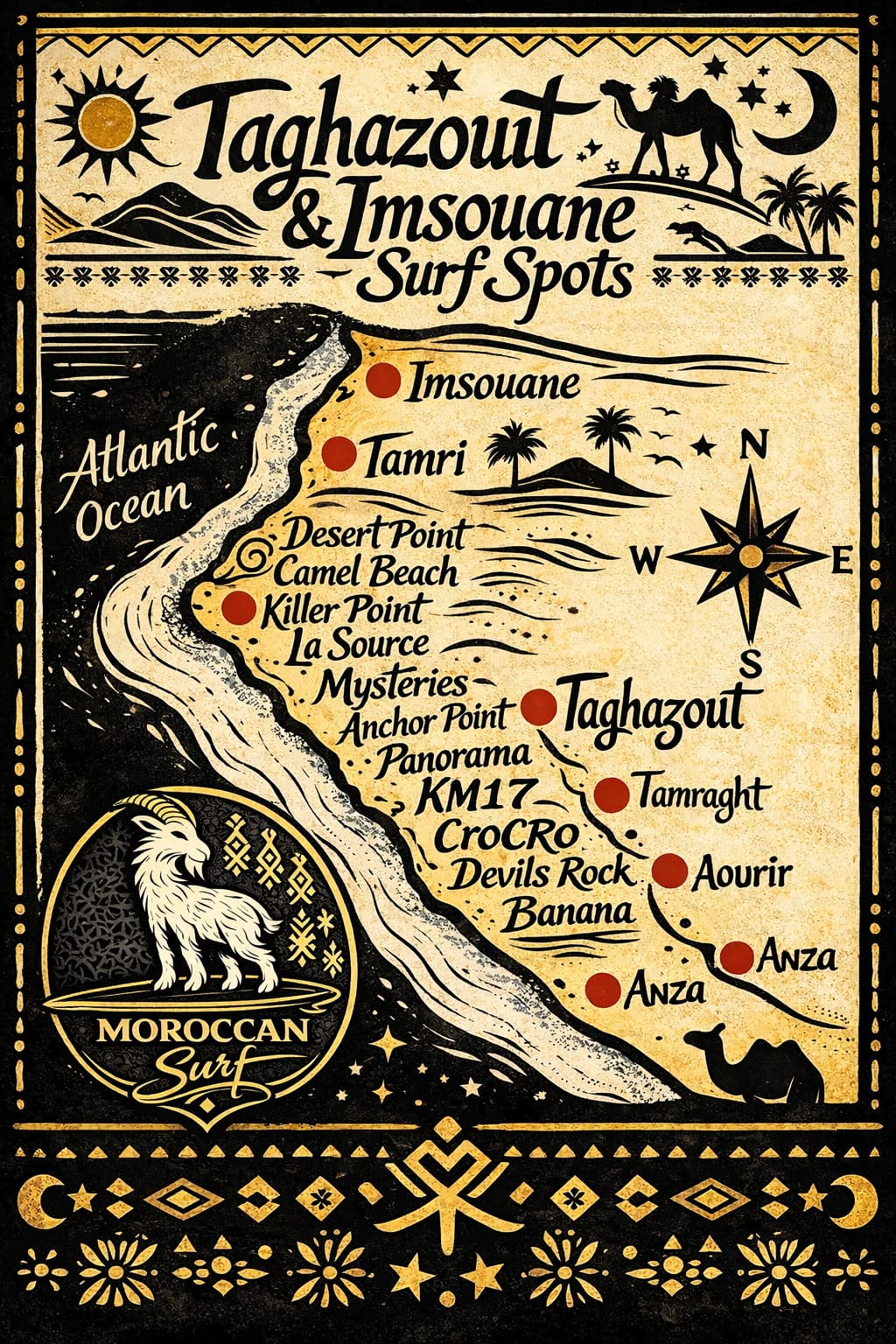 Chase the magic of Morocco’s Atlantic coast with our Taghazout & Imsouane Surf Spots Map.